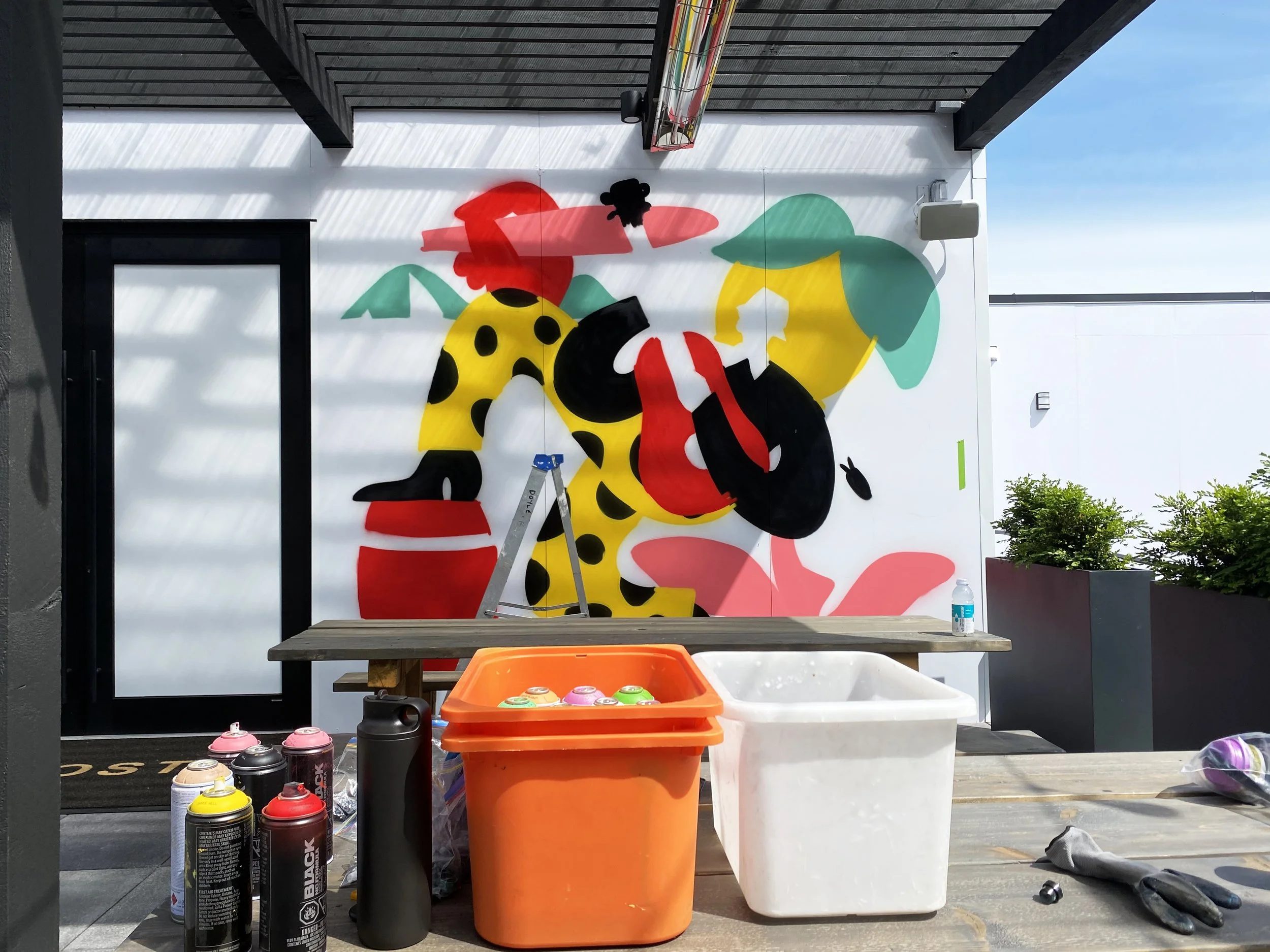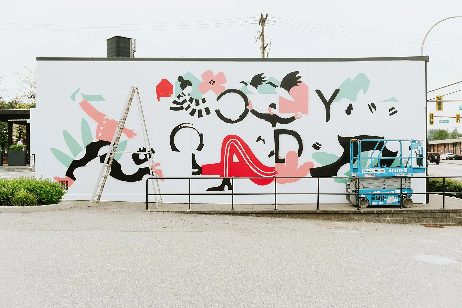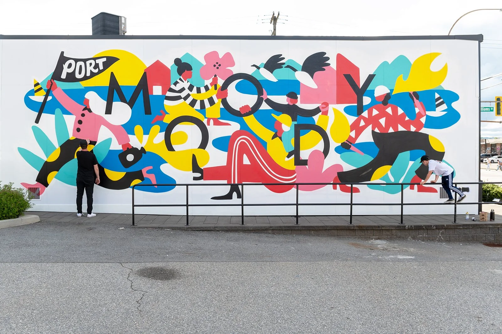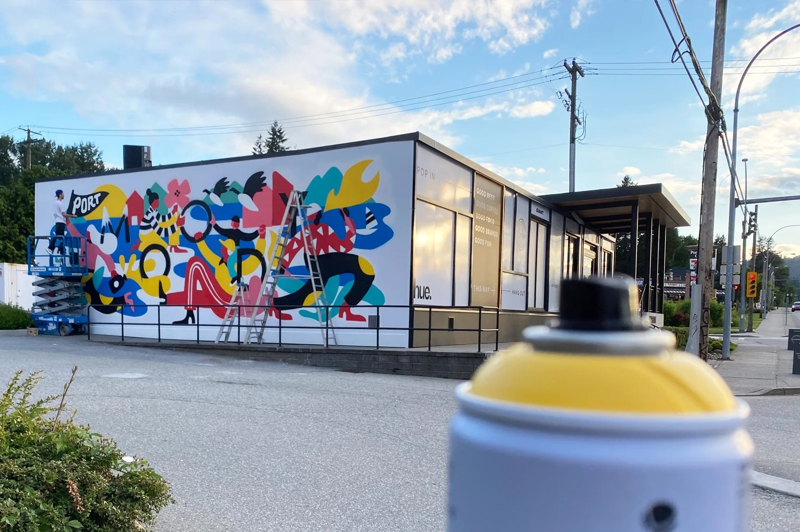 Outpost is a collection of brands built for life in Port Moody. Marcon commissioned me to design and paint a large mural facing St. John’s street and 2 additional pieces on the rear patio. The direction was to encompass key attributes of Port Moody’s people, landmarks and lifestyle, while creating an inviting composition of colour and shapes that complimented the space and surrounding envirnoment.